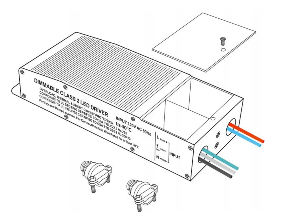 Route the input wires through the clamp connector and connect the wires using the UL listed wire nuts. The drivers case must be grounded in accordance with the National Electric Code.