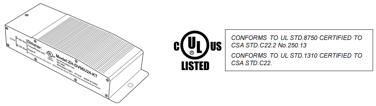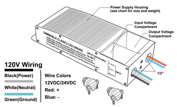 The LED light transformer is a 100-120VAC input metal aluminum case output 12V or 24V high PFC junction box dimmable power supply. The phase dimmable led driver is UL/cUL Class 2 rated for indoor and outdoor lighting.